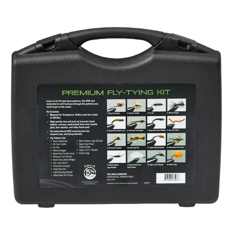 Learn to tie the classics with this comprehensive Orvis Premium Fly-Tying Kit. Materials for 16 patterns, 10 flies each, for a total of 160 flies. 8 basic patterns and 8 guide-proven premium patterns. Comes with instructional DVD with tutorials for every pattern made expressly for the kit, and it also goes over basic tool instructions. Plus, it was made by Tim Flagler of Tightline Productions, considered by most to be the best fly-tying videographer around. High-quality vise and tool set (includes ceramic lined bobbin, scissors, bodkin, half-hitch tool, hackle plier, hairstacker, and whip finish tool. Durable and convenient carrying case. Â